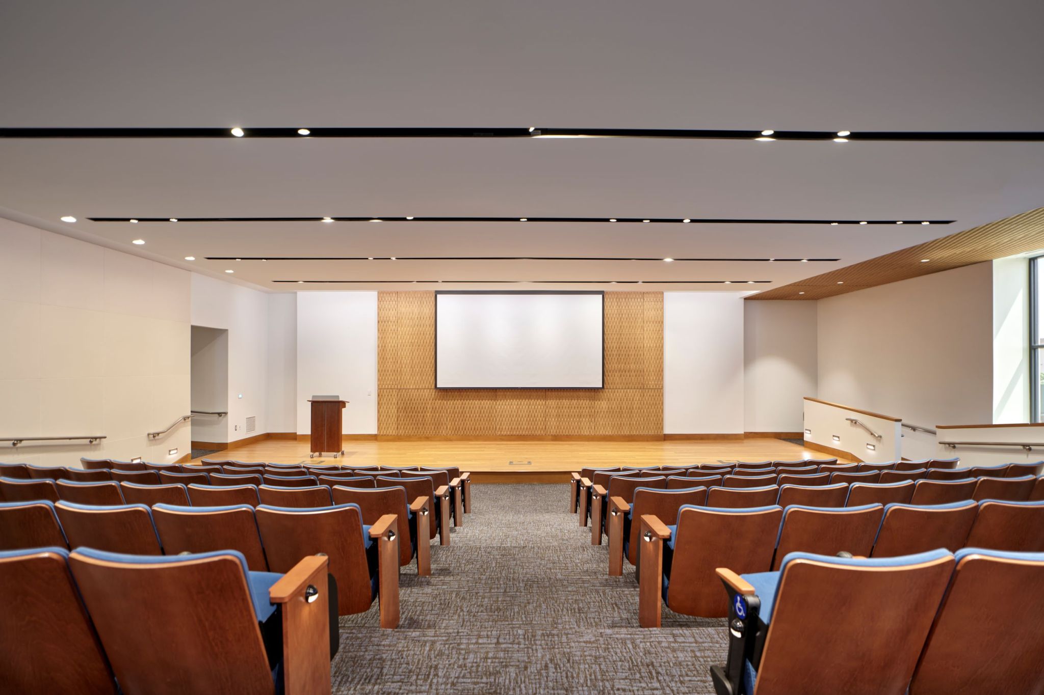 Modern lecture hall with quality seating for up to 104 people and a beautiful hardwood stage; ideal setting for lectures,...