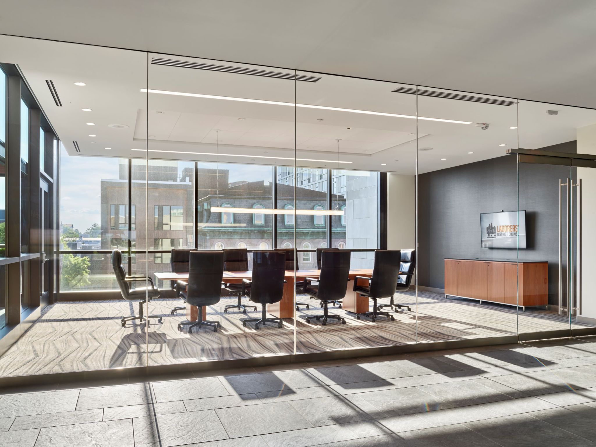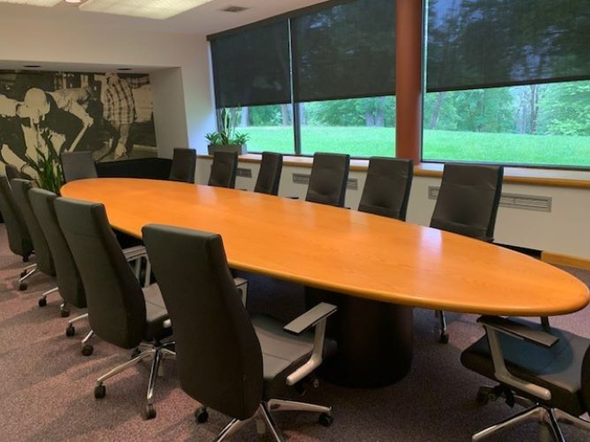 This room is conference style. Room for 14 at the conference table. Teleconference capabilities are available. Additional seating is available.