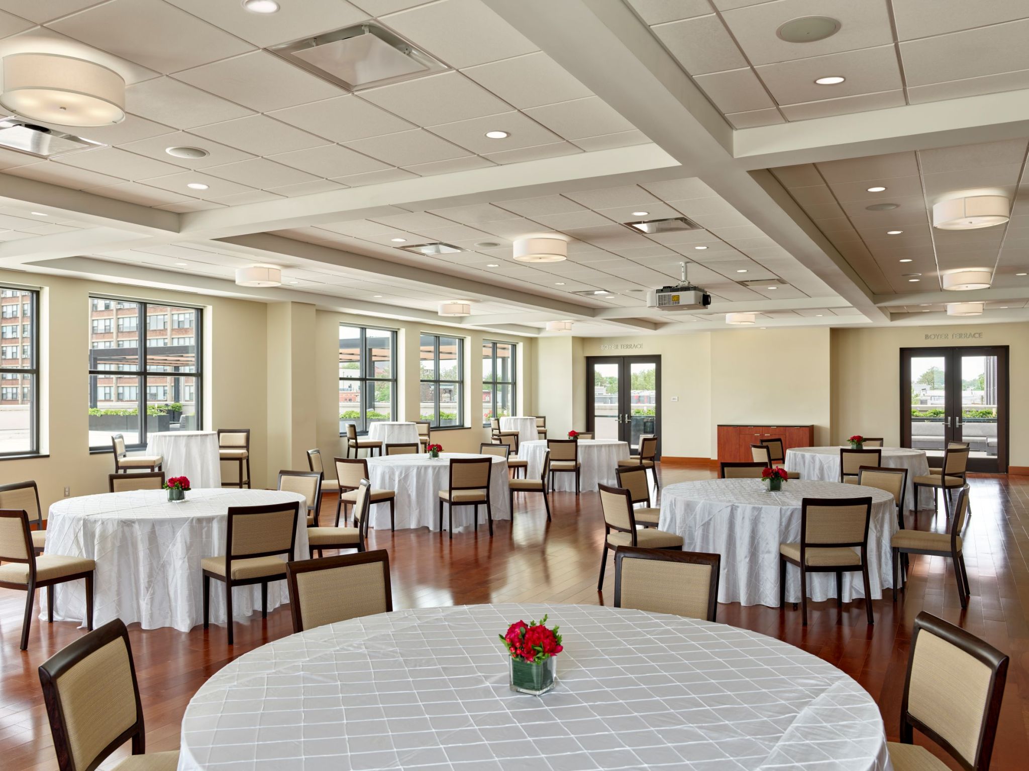 Modern multipurpose event space that accommodates 100 people seated at tables or up to 150 guests standing. It features stage...