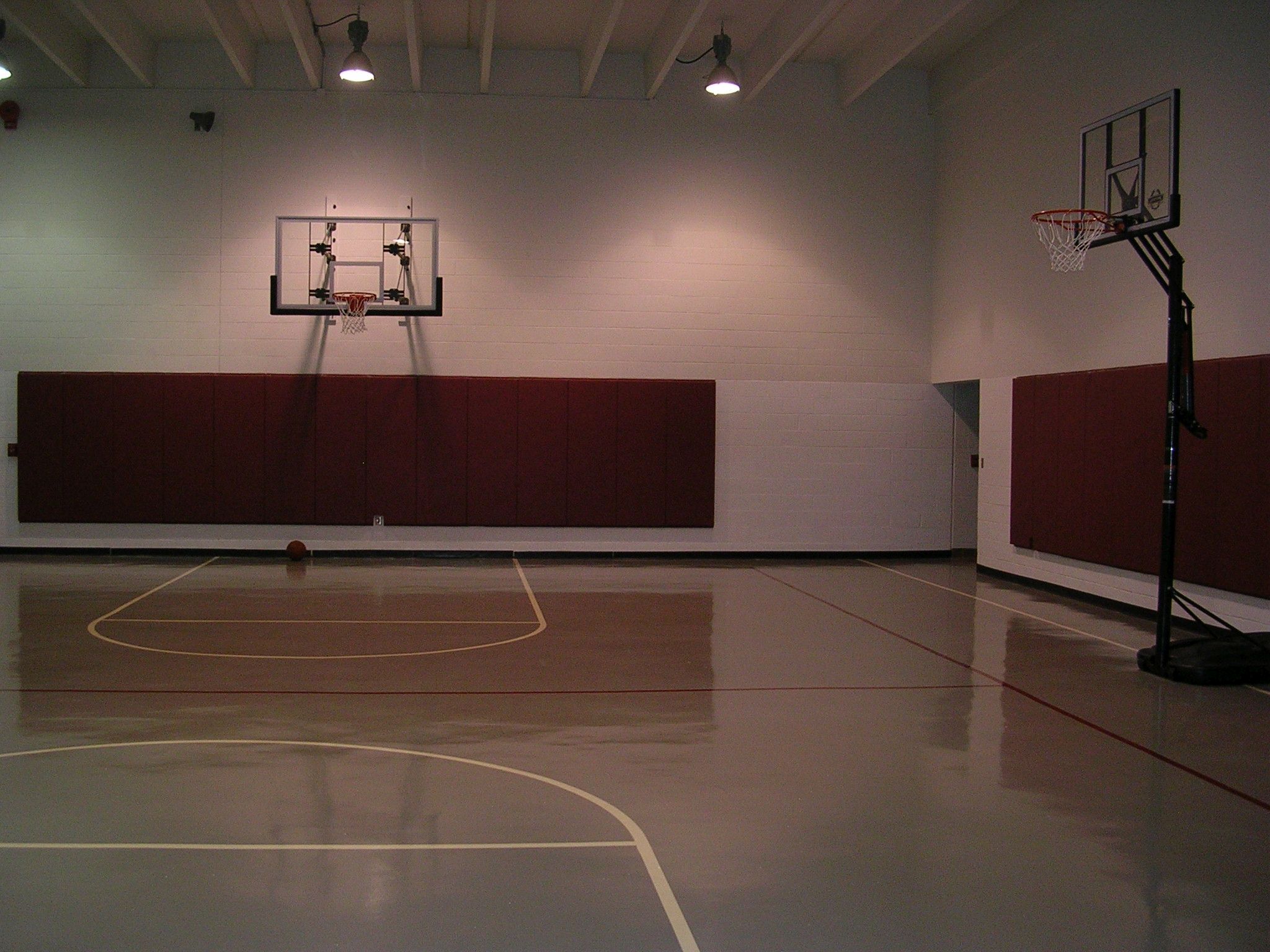 Gymnasium equipped with two fixed standard basketball courts and two movable basketball courts.